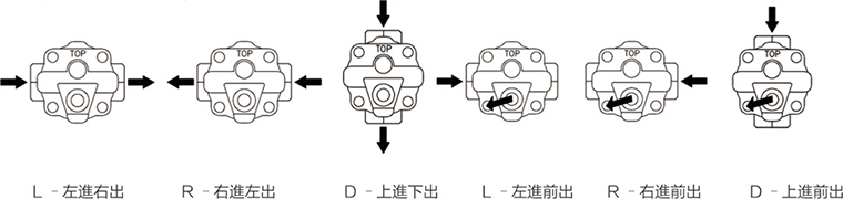 - 本體可在現場配管時依需要拆下四個螺絲,蓋子不動本體回轉,可以左進右出、右進左出、上進下出、左進前出、右進前出、上進前出共六中選擇,依箭頭指示。